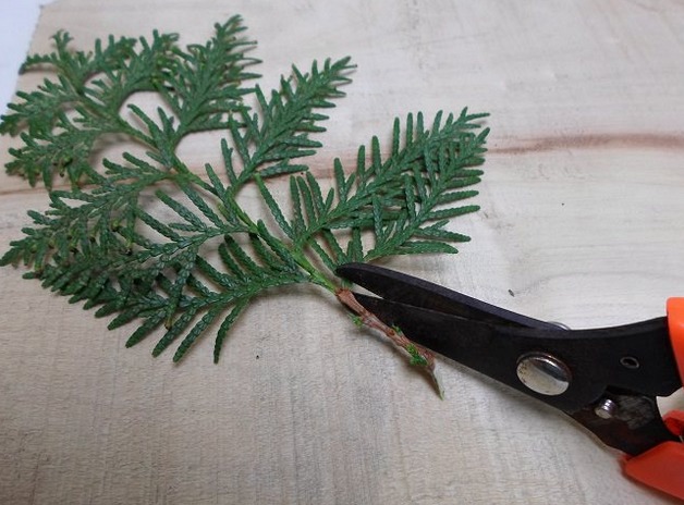 Després d’haver escollit un bonic tuja adult i armat amb tisores afilades, podeu començar a collir el futur material de plantació.