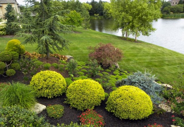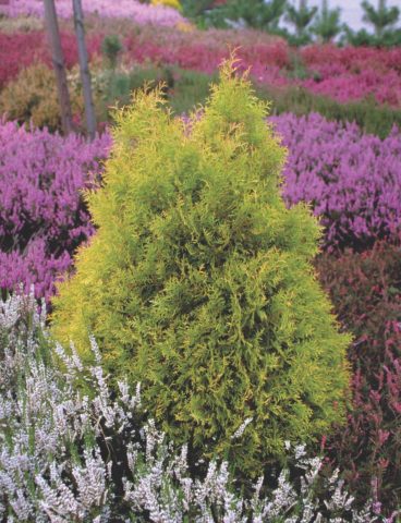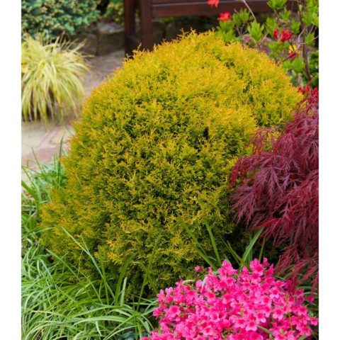 Thuja com a part d'una composició amb plantes amb flors i arbustos exòtics.