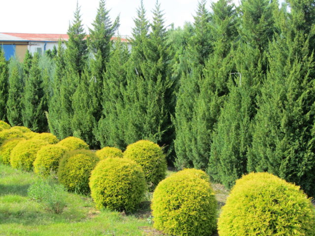 Tuia en plantació grupal amb coníferes de ginebró i nan.