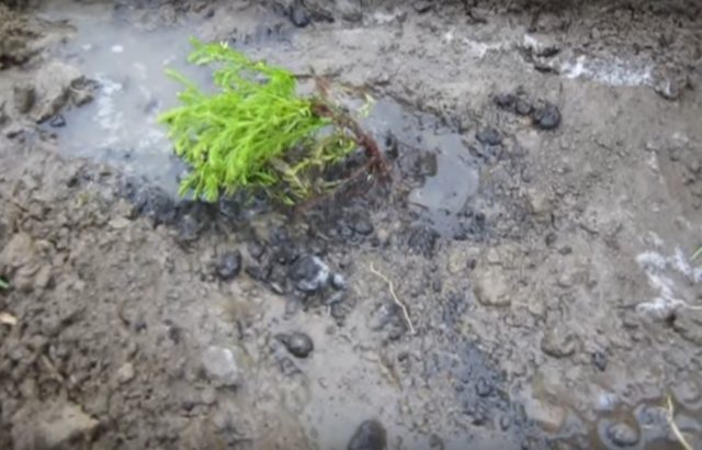 És impossible aprofundir el coll o elevar-lo fortament per sobre del sòl; l'èxit de la supervivència de la tuia al lloc depèn d'aquest moment. A la foto, un arbust de Reingold de thuja després de plantar-lo.