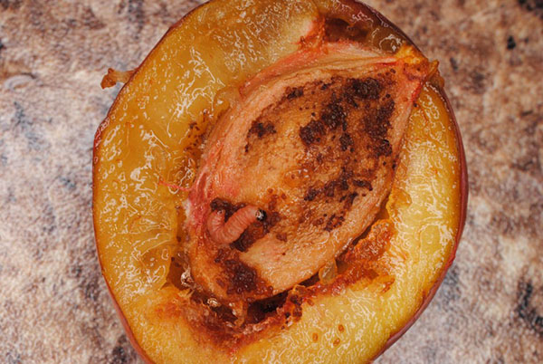 Les erugues larvars de l’arna s’alimenten de la polpa de la drupa, destruint el cultiu