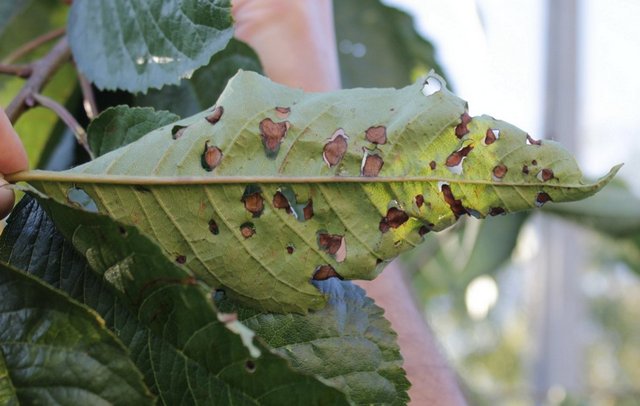 - Punt de forat... Apareixen taques amb un halo al fullatge de la planta, l’interior s’asseca i cau, es formen forats. L’arbre no obté l’aliment que necessita. El tractament es realitza amb barreja de Bordeus o sulfat de coure.