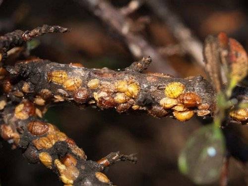 Cal controlar constantment l’absència de malalties a l’arbre, amb els primers signes de la malaltia, cal iniciar immediatament la lluita, tractar-la amb mitjans i preparats especials. A la foto de la pruna de cirerer Tsarskaya, podem veure les fulles danyades per l’òxid.