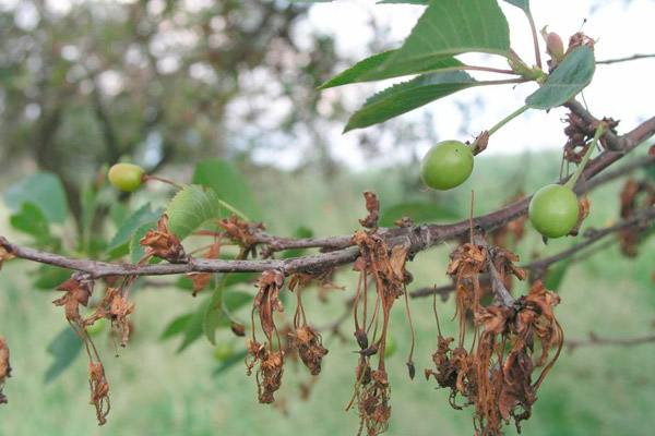 Moniliosi | Els brots es tornen marrons i s’assequen. Apareixen creixements blancs als fruits. | Polvorització d’arbres amb líquid bordeus. | 1. Encalat de troncs d’arbres. 2. Afluixar el sòl al tronc. 3. Tractament preventiu a la primavera i la tardor. |