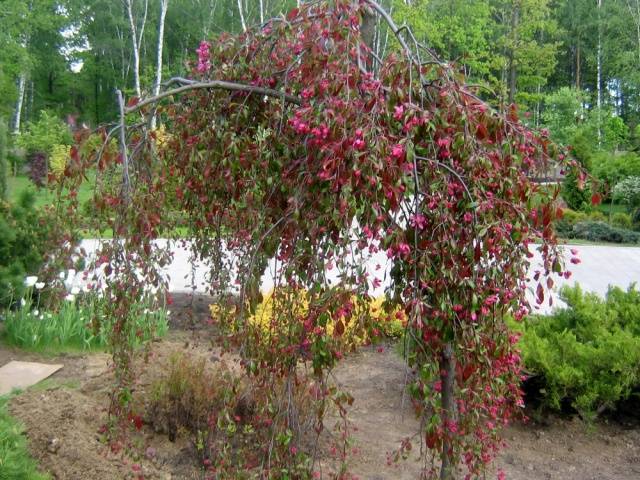 L'única diferència és que per als arbres que es conreen només per a la collita i per al pomer Nedzwiecki, el propòsit de la poda i la formació de la corona serà lleugerament diferent. Al cap i a la fi, el més important és donar un aspecte decoratiu per crear un disseny de paisatges. Per exemple, el plorer pomer de Nedzvetsky o Prirechnaya creix fins als 12 metres d'alçada, té una corona esfèrica i estesa. Les seves branques cauen a terra.
