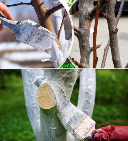 Podeu comprar una solució de blanqueig en una botiga o elaborar-la vosaltres mateixos. Barregeu 1,5 kg d’argila amb 2 kg de calç en 1 galleda d’aigua. Una planta adulta es blanqueja a les branques inferiors i es recomana cobrir completament la plàntula.
