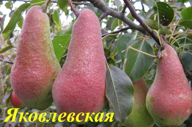 Varietat Yakovlevskaya Zimny, forma un arbre d’altura mitjana amb una corona en forma d’escombra de brots rectes marrons vermells. Fruits de forma regular allargats en forma de pera de forma regular, que pesen uns 125 g, de color verd amb un color vermell bordeus i punts grisos ben visibles.