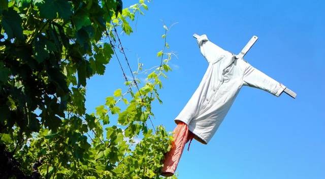 Una antiga manera provada d’espantar els ocells és instal·lar un espantaocells al lloc. Normalment es fabrica amb materials de rebuig de manera que s’assembli a una silueta humana.