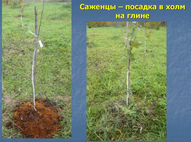 La principal diferència entre la tècnica de plantació de poma siberiana i la tècnica clàssica és plantar en petits monticles i no en forats. Per què els forats són tan dolents? S'hi acumula aigua fosa, cosa que provoca amortiment i les gelades que tornen amenacen de trencar el coll de l'arrel. Però fer crestes altes també és un excés. Això conduirà a la congelació del sistema arrel jove del pomer. Els túmuls haurien de fer uns 35 cm, cosa suficient per a la sortida d’excés d’humitat. A la zona del coll de l’arrel hi hauria d’haver un petit forat per tal de proporcionar accés lliure a l’aire fresc; no es pot cobrir de terra. Al mateix temps, s’està preparant el pou d’aterratge, però no tan profund.