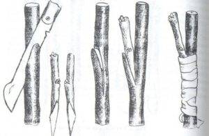 - La tija s'insereix a la butxaca amb una falca, el tall s'embolica amb cinta adhesiva i es tracta amb un to de jardí.