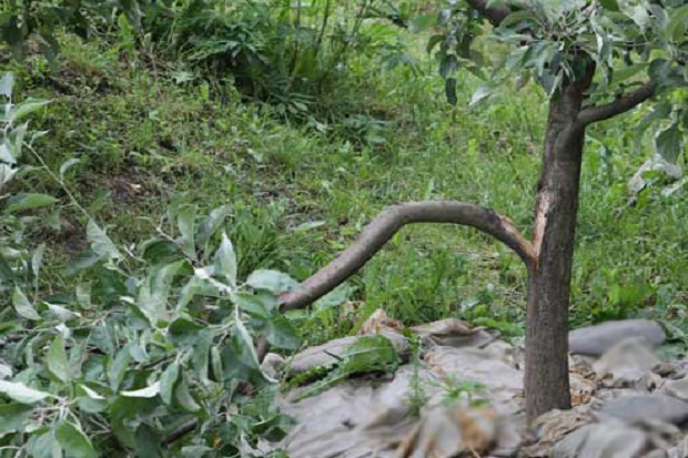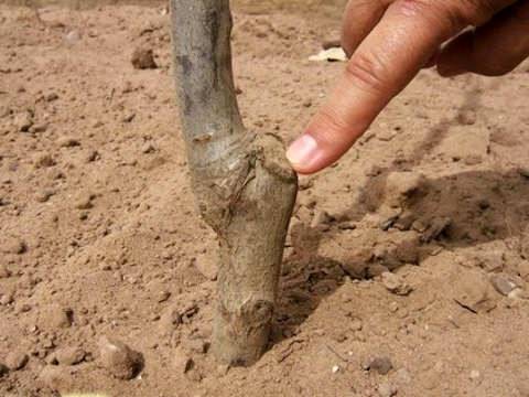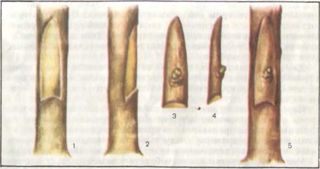 En els esqueixos, heu de trencar tots els cabdells perquè no comencin a créixer i també fer talls oblics de 2-3 cm de llarg.Les vores de la zona de portaempelts danyada es tallen en forma de T, les vores de l’escorça es plegen cap enrere i s’hi porten les vores del tall. Els "ponts" estan ben fixats i després s'emboliquen amb paper d'alumini, formant un hivernacle natural.