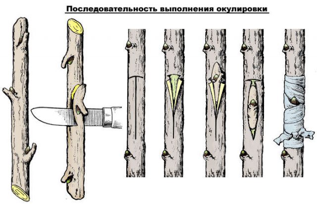 Amb aquest mètode d’inoculació, l’empelt és un ronyó. Els jardiners solen anomenar-lo "mirilla", d'aquí el nom del mètode (okulus (lat) - ull). El brot es pren dels esqueixos de la varietat desitjada. Si es cull a la tardor, aquesta brotarà amb un ull brotant, un brot després de l’empelt començarà a créixer aquesta primavera. Si el brot es pren d'un arbre verd, l'empelt es realitza a l'estiu i el brot començarà a créixer a partir d'ella només la primavera vinent. Aquest mètode s’anomena gemmació dels ulls dormits.