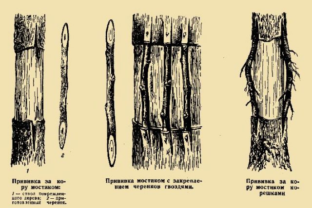 Abans d’empeltar una pruna amb un pont (al carril central és maig), heu de pintar o tapar totes les zones danyades per endavant, en cas contrari l’arbre començarà a assecar-se. Per a "ponts", els esqueixos collits l'any passat són adequats i poden ser d'una altra varietat o fins i tot d'espècies diferents. Si el tronc de l'arbre malmès és petit, només calen 2 esqueixos, si són grans, fins a 8.