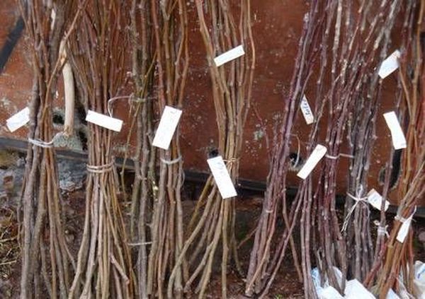Hi ha diverses maneres de mantenir els talls tallats fins a la primavera. El més fàcil és a la neu. Per fer-ho, heu de cavar un petit forat, el fons del qual ha d’estar revestit de branques d’avet. A continuació, els esqueixos lligats en raïms s’apilen i es cobreixen amb les mateixes branques d’avet a la part superior. A continuació, es tira una capa de terra o palla per sobre, després de la qual cosa es cobreix tot amb una gruixuda capa de neu.