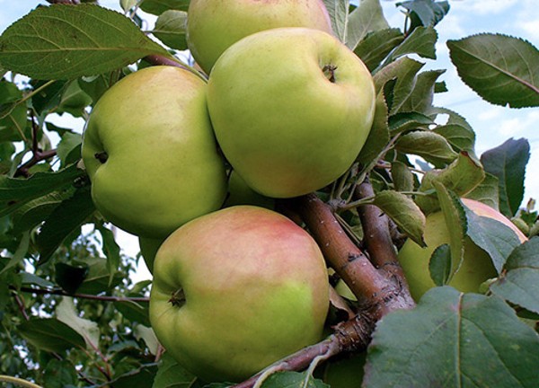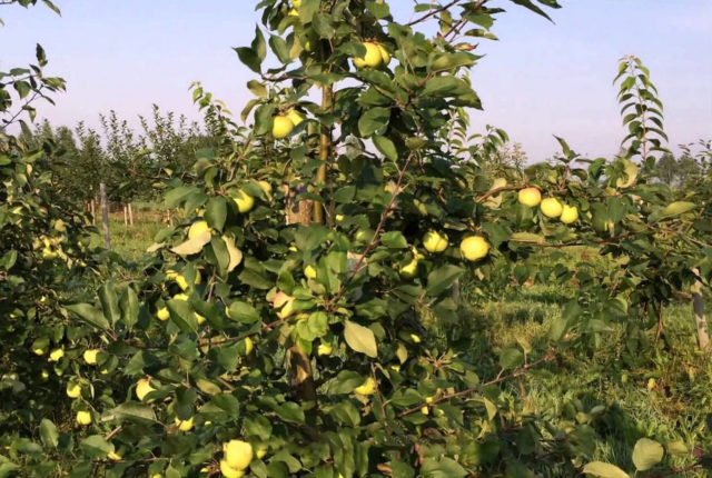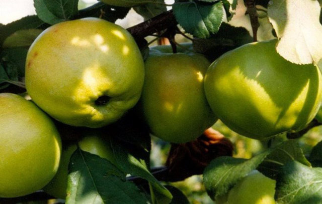 Les pomes són rodones, lleugerament allargades cap al final, de color groc-verdós amb una taca rosa borrosa amb prou feines notable. Als costats del fruit hi ha fines sutures convexes. La mida és mitjana, el pes aproximat d’una poma és de 180 g, tot i que pot variar de 110 g a 200 g. La pell és brillant i fina. No hi ha cap floració blanca. La polpa és de sucosa estructura granular. En una poma madura, és blanca, en una fruita no madura, la carn és de color verdós.
