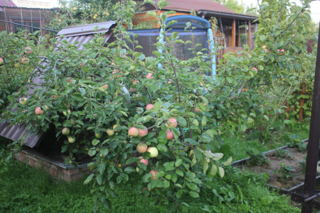 L'alçada de l'arbre és de 2 a 2,5 m (una planta cultivada sobre portaempelts no creixerà més de 2 m). La circumferència de la corona arriba a 3,5 m de diàmetre, té un alt ritme de creixement. Les branques joves són de gruix mitjà, l’escorça és de color marró fosc, les branques i els brots joves són més joves, més clars. Els brots creixen horitzontalment, caient lleugerament cap avall. El fullatge és verd ric, de gran corona. A la part superior es ressegueix una lleugera pubescència. Des de la branca, el fullatge cau a terra.