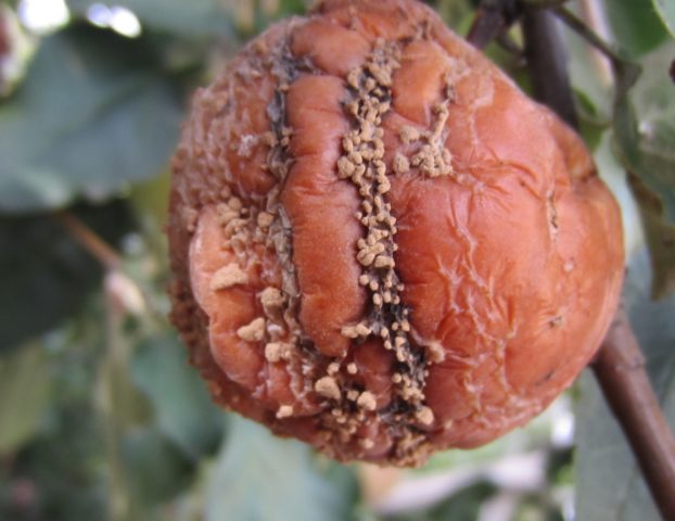 - Podridura de la fruita. El primer signe de la malaltia són taques marrons a la superfície del fruit. Al cap d’un temps, les pomes es deformen i es podreixen completament. En el curs del tractament, els fruits afectats s’arrencen i l’arbre es tracta amb preparats fungicides.