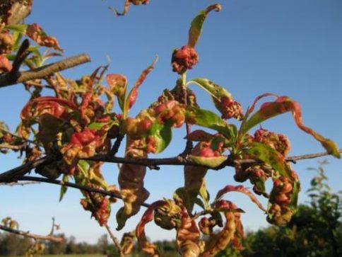 La foto següent mostra un préssec de la varietat primerenca de Kievsky, afectada per les fulles arrissades.