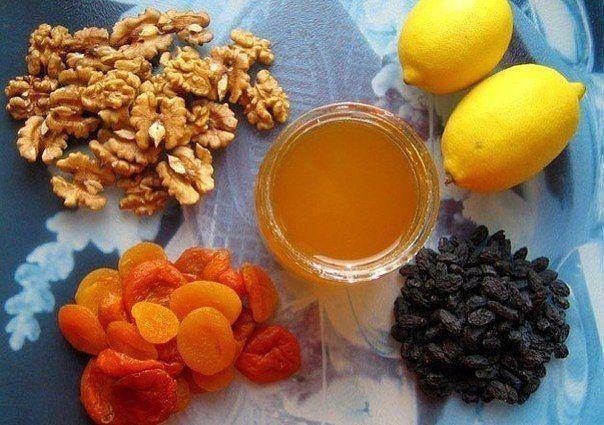 Tritureu 200 g d'albercocs secs, una quantitat similar de prunes prunes, afegiu 100 g de nous mòltes. El gruel es barreja amb 40 g de mel líquida. La massa acabada es consumeix en 40 g al matí i al vespre durant trenta dies.