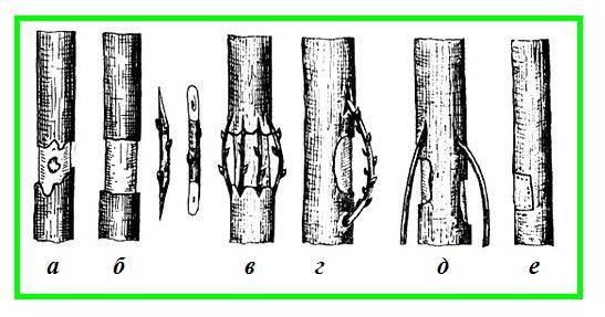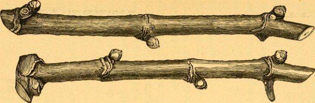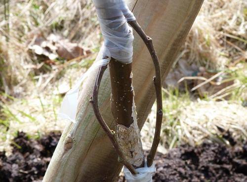 - El mànec inserit s’ha d’embolicar amb força i, a continuació, l’altre extrem s’ha d’inserir a la ranura superior. La ubicació dels ponts per a la inoculació és estrictament vertical i necessàriament arquejada. Aquesta posició garanteix un flux normal de saba.