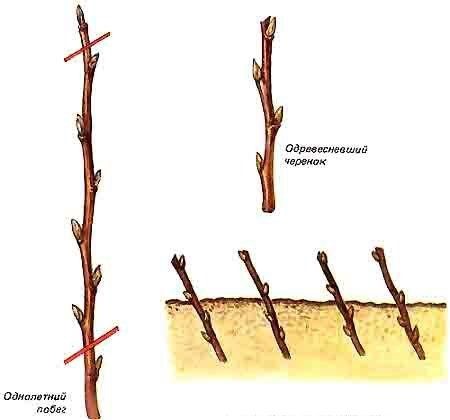 Apte per a varietats fosques. Un brot lignificat es talla de l’arbust mare i es divideix en diverses parts de 20-25 cm. Cadascuna ha de tenir 2-3 fulles. Després de 12-13 hores de sedimentació, es planten en una solució especial (estimulant del creixement).