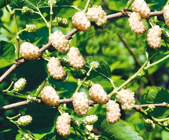 Les baies semblen mores en aparença, les tonalitats són molt diferents. La morera de color fosc té fruits blancs. Els fruits es poden menjar, la mida és d’uns 2-3 cm, les baies tenen un aroma agradable.