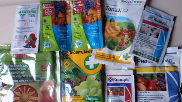 - "Kinmix"... El medicament s’utilitza al març o a l’abril, abans de la floració dels cabdells. Dosi del producte: 2,5 ml del medicament diluït amb 1 litre d’aigua. La barreja resultant es dilueix una vegada més en 10 litres d’aigua i es pulveritzen les plantacions.