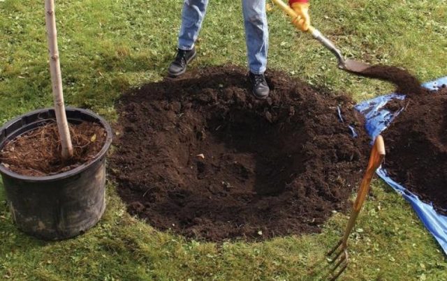 - Comencen a excavar el forat a partir de l’eliminació de terres fèrtils amb un gruix d’uns 30 cm. S'elimina tota la resta de sòl infèrtil de la fossa. En el futur, no serà útil. La mida del forat depèn del sistema arrel de la plàntula. Normalment, amb 60 cm de profunditat i amplada n’hi ha prou.