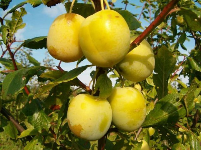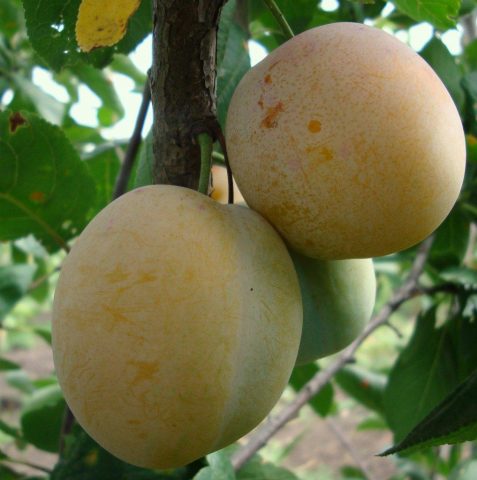 El rendiment de la varietat és mitjà. Els fruits de les plantacions joves són grans. El pes d’una pruna és de fins a 50 g Fruits rodons de color verd groc. Es nota la costura lateral. La meitat de la pruna és més gran que l’altra.