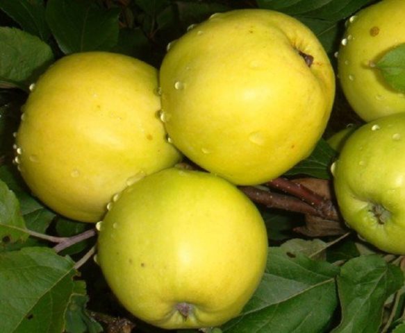 - Els fruits de la varietat nana són grans, el pes d’una poma és de 120-140 g. En bones condicions de cultiu i quan arriba a la maduresa, pot arribar a ser de 200 g. La forma dels fruits és plana, en alguns hi ha una lleugera nervadura, l’embut s’expressa dèbilment. La varietat va heretar l'aparició de pomes de l'alemanya Eliza Rathke. El color principal és el verd groguenc.El color de la coberta pot estar completament absent o aparèixer com un color vermell fosc i desigual. Normalment es troba al costat de la llum solar i indica la maduresa del fruit del pomer Chudnoye. La pell és prima, a sota hi apareixen petits punts. La polpa és sucosa, però ferma, s’esgota quan es menja.