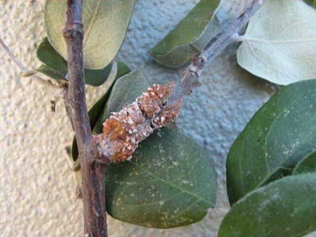 Quan estan infestades de pugons, les plaques de les fulles es cobreixen amb una floració enganxosa i s’enrotllen
