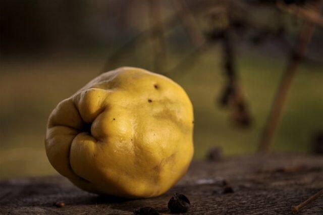 El codonyat colpejat per l’arna cau aviat de les branques i sembla estar madur prematurament