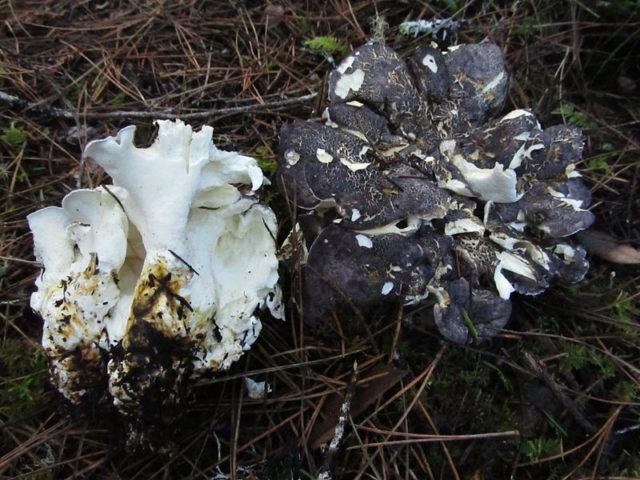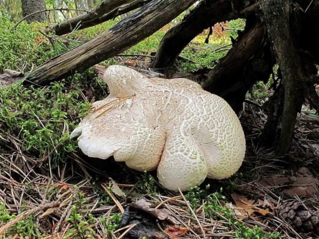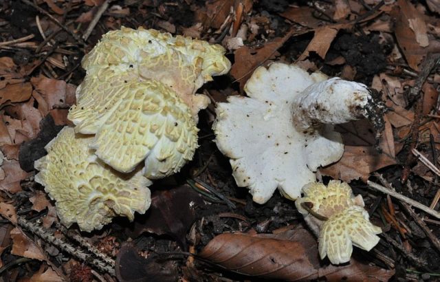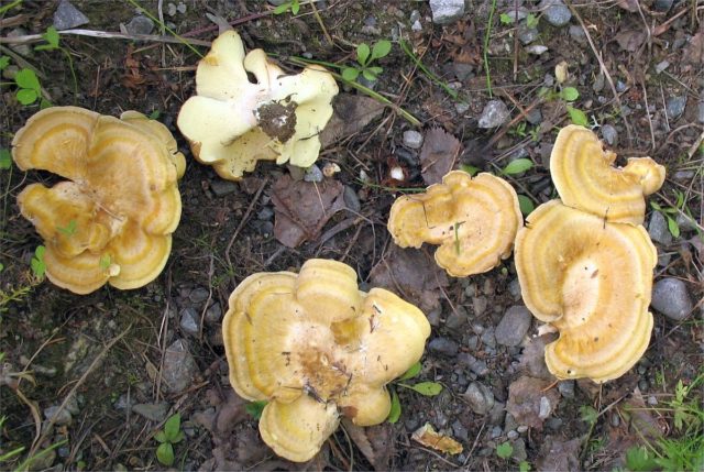 Albatrellus confluens (Albatrellus confluens). Condicionalment comestible. El cos del fruit és gran, les capes creixen fins a 15 cm de diàmetre, llisa, sense escates pronunciades. El color és cremós, sorrenc-ocre.