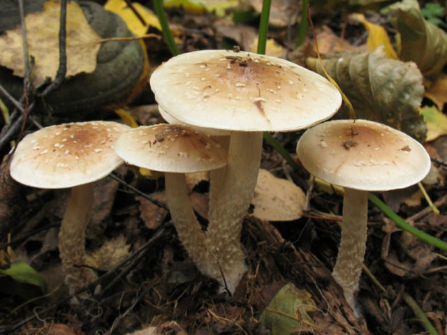 Un barret semiesfèric, convex i molt petit d'escates enganxoses a una edat primerenca té un color blanc clar o groguenc. Amb el pas del temps, la seva mida augmenta i fa una mitjana de 6 cm de diàmetre i el color es torna groc argila. Un tubercle fosc adorna la part central de la tapa, coberta de moc, no només amb molta humitat, sinó també amb temps sec. Les escates escamoses estretes són molt visibles en els joves. Les plaques de la superfície interna serveixen per a la formació d’espores i una reproducció posterior. Els bolets joves tenen un color clar de les plaques, els vells són foscos, de color marró clar.
