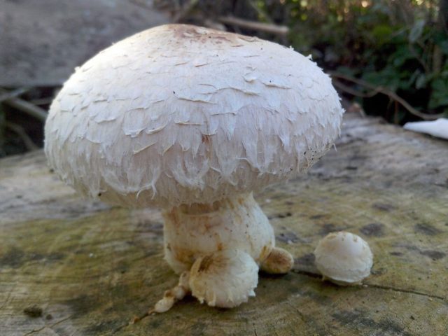La superfície marró clar o blanc llimona de la tapa, de 5-7 cm de diàmetre, està completament coberta amb nombroses escates de color crema. El barret té una forma semiesfèrica amb vores ondulades i fibroses. La polpa és densa, blanca, amb l’edat adquireix un color marró fosc. La part inferior està coronada amb nombroses plaques fosques i està coberta amb una densa pel·lícula de llum, que trenca amb l’edat del fong i adorna la cama en forma d’anell.