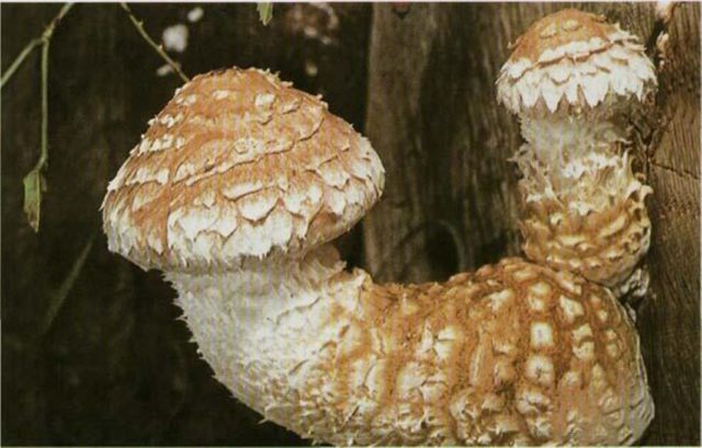 - Escala daurada... Un exemplar comestible. El diàmetre del casquet amb llimona rovellada i amb forma de campana és de 18 cm, la superfície està coberta amb grans escates vermelloses. Carn sucosa de color crema clar. Tija marró llimona, 10 cm d'alçada, coberta amb nombroses escates marró taronja. Creix en famílies als troncs dels arbres de fulla caduca o als seus rizomes. La fructificació es produeix d’agost a octubre.