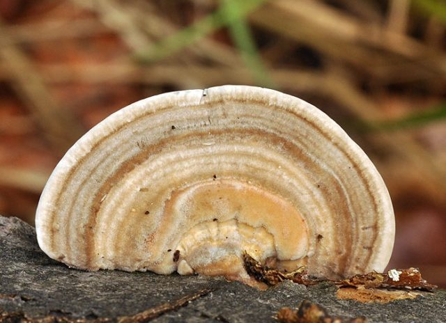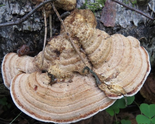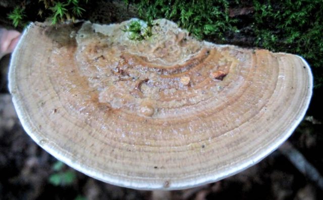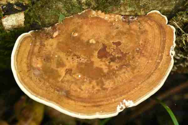 Fong Tinder, accidentat, marró clar; ratlles radials, berrugues i una vora blanca al llarg de la vora són visibles a la seva superfície