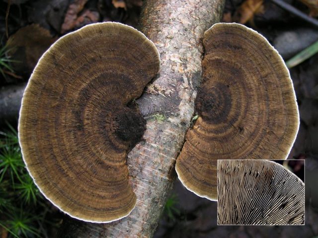 Les vores del capell són fines, vorejades de blanc o gris. A la superfície poden aparèixer berrugues de color marró vermellós, que sovint s’agrupen al centre. De vegades, hi ha fongs d’escaig coberts de vellositats curtes. El bolet no té pota, el capell creix directament del tronc de l’arbre. L’himenòfor és tubular, al principi blanc, es torna gradualment beix i envellit a gris. Els porus són allargats-allargats, segons l'edat, poden ser: