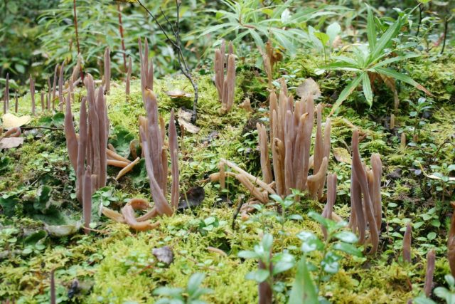 - Alloclavaria purpurea (Clavaria purpurea). El fong és un cos fructífer cilíndric allargat, de fins a 10-15 cm d’alçada, amb les puntes punxegudes o arrodonides. El seu color és de color porpra clar, amb l’edat es torna marró clar, de vegades ocre, argilós o beix. Normalment creixen en grups densos, cadascun dels quals pot contenir fins a 20 peces. Clavaria purpurea creix, principalment en boscos de coníferes. Segons algunes fonts, forma micoriza amb les arrels de les coníferes i les molses. L’hàbitat principal és Amèrica del Nord, però es troba a la zona temperada de Rússia i Europa, així com a la Xina i Escandinàvia. No hi ha dades sobre l’edibilitat del bolet, però, ni sobre la seva toxicitat.
