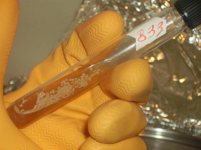 - obriu la proveta i col·loqueu ràpidament un tros de teixit de bolet xampinyó sobre el mitjà nutritiu; totes les accions s’han de dur a terme sobre la flama del cremador per evitar l’entrada de microflora patògena al medi;