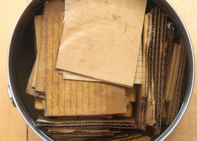 - el cartró, tallat a trossos petits, es remull en aigua bullida i tèbia durant aproximadament una hora o més, i després es posa en un recipient de plàstic ampli amb forats de drenatge;