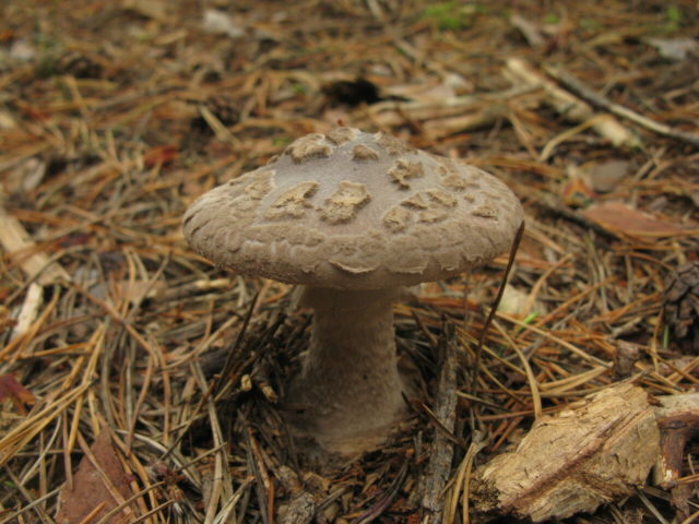 A l’agàric de la mosca, pot arribar als 2 cm de diàmetre i als 13 cm d’alçada. En la forma, la part inferior del cos fructífer és similar a un cilindre amb una zona engrossada prop de la base. El color de la tija va del blanc pur al lleugerament gris.