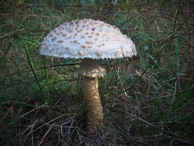 - Paraigües blanc - una espècie comestible amb un regust peculiar, que recorda el gust del pollastre. En els exemplars joves, el capell és lleugerament allargat; a mesura que creix, es fa mig obert i, per plena maduresa, adopta la forma d’un paraigua obert. La superfície blanca com la neu està coberta de nombroses escates fosques. La cama és prima i llarga, de colors que coincideixen amb la gorra. La carn blanca o grisa és fràgil, amb un gust i una olor agradables.