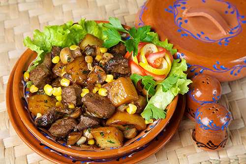 Les verdures també es disposen en una olla, s’afegeixen crema agra, pebre i sal. Estofeu al forn preescalfat fins que les patates estiguin cuites. Això trigarà uns 45 minuts.