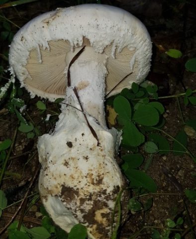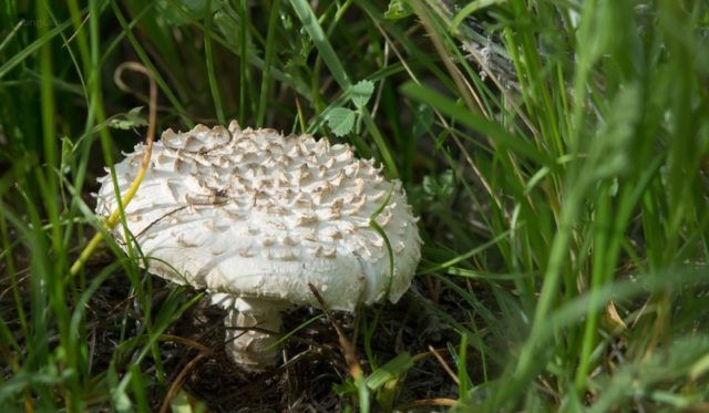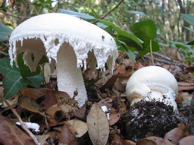 És una agàrica mosca pudent. Es diu així per una raó. Aquest bolet té una desagradable olor a clor. El diàmetre del tap és de fins a 11 cm. El color és blanc o blanc trencat. La pell seca és brillant, enganxosa i viscosa.