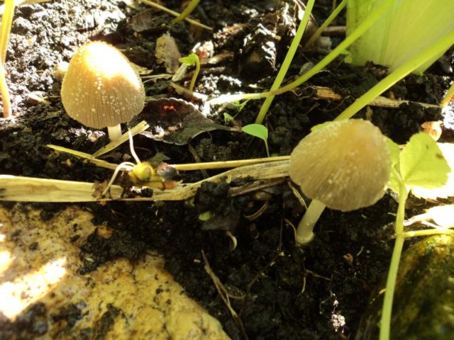 A la fase inicial, aquest bolet té un casquet en forma d’ou, més endavant es torna en forma de campana i després es postra. A l'interior, hi ha plaques blanques i freqüents, que comencen a enfosquir-se amb l'edat. Pols d’espores negres. Per tant, aquesta espècie és similar a l’escarabat domèstic en molts aspectes.Tanmateix, un tret distintiu és la petita mida del cos de fruit del bessó, i a la superfície del capell hi ha escates brillants que es renten fàcilment amb aigua corrent. A més, a aquesta varietat li manca el miceli marró rovellat de la cama, que és inherent a l’escarabat de fem casolà. Tot i que el doppelganger és un bolet comestible, no està dotat de palatabilitat cancel·lada.