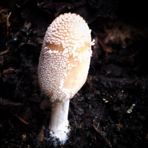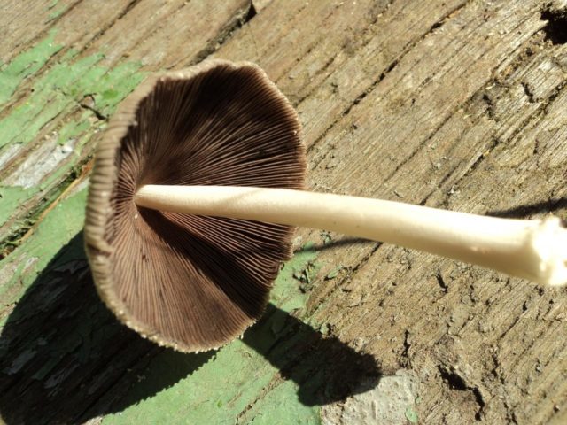 - A la fase inicial de desenvolupament, la tapa té una forma el·líptica o ovoide. A mesura que creix, es fa campaniforme i al cap d’un temps s’estén mig amb un tubercle clarament visible al centre. Segons la forma, la mida de la tapa varia de 2,5 a 6,5 cm de diàmetre. La pell és de color ocre clar o marró amb una taca més fosca al centre. El capell jove d’aquest exemplar està cobert amb una fina capa granulosa de color blanc, que desapareix a l’edat adulta. Al seu costat interior, hi ha plaques fines, freqüents, amples i blanques, que acaben canviant el seu color a un to marró o marró fosc amb taques clares. Pols d’espores, negre.
