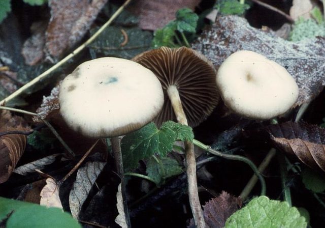 Amb l'edat, la cama de Psilocybe bohemica canvia el seu color cremós a blavós