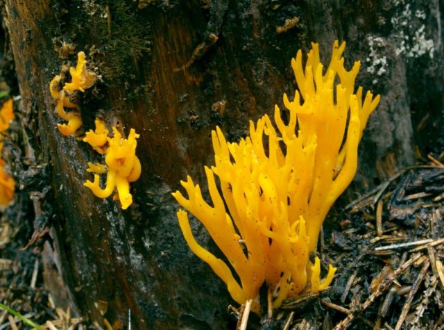 El calocera gomós és un bessó no comestible. Es pot trobar a socs i fustes mortes. Està pintat de groc brillant. Té una carn densa i gelatinosa.