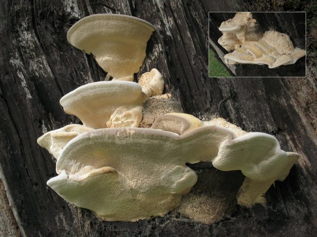 Als cossos fructífers anuals, els capítols voladissos són sèssils, semicirculars o gairebé arrodonits, de 3 a 20 cm d’amplada Els polipors creixen d’un en un o en famílies petites, s’adhereixen a la fusta amb una base ampla, no hi ha potes. Els fongs Tinder creixen fins a 6,5 cm de gruix. Les tapes planes es rebomboren a causa de la pujada del tubercle a la base. La pell jove és vellutada, blanca o grisenca. A continuació, es formen ratlles concèntriques de diversos colors, però més fosques, de tons oliva a marró. A mesura que el fong tinder creix, la pell es torna llisa, sense pubescència, de diversos tons ocres cremosos.
